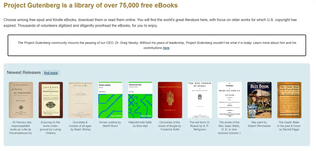 Project Gutenberg古腾堡计划,这个网站虽然只有7万5千本电子书,但是其全部都是有公共版权的电子书籍